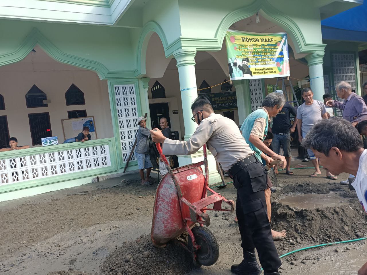Terlihat dalam kegiatan tersebut Briptu Dermawan Hamka membantu masyarakat lingkungan randangan saat bergotongroyong memperbaiki masjid Babussalam Randangan.