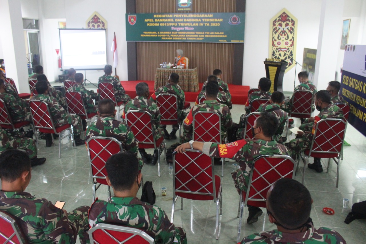 Beberapa hal yang di sampaikan Dandim 0913/PPU kepada para Danramil dan Babinsa bahwa apel ini merupakan program yang dilaksanakan sebagai pembinaan terhadap para Danramil, Babinsa sehingga program kerja serta kebijakan-kebijakan dari Komando atas dapat disampaikan langsung kepada para Danramil, Babinsa agar lebih profesional dalam meningkatkan kinerja dalam mendukung tugas TNI AD dalam penanganan Covid-19 di wilayah Kabupaten PPU.