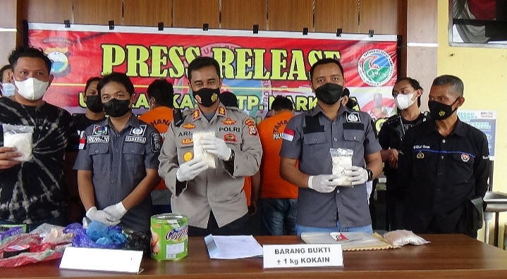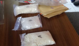 Dari hasil penggerebekan dan penangkapan ketiga pelaku team Satresnarkoba berhasil menyita barang bukti berupa 2 Bungkus Narkotika golongan I jenis Heroin seberat kurang lebih 1 (satu) kilogram, bersama satu buah karus beras merek Mawar, satu buah kaleng biskuit, 4kantong plastik berwarna biru, 1 kantong plastik berwarna ungu, 1 kantong plastik berwarna hitam, dan 2 bungkusan yang dililit menggunakan isolasi berwarna coklat.”