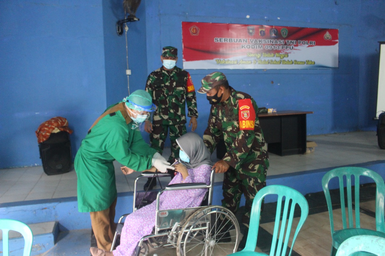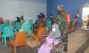 Melihat seorang perempuan dengan menaiki kursi roda, Babinsa Koramil 0913-01/Penajam Kodim 0913/PPU Sertu Khusaini langsung menghampirinya dan kemudian mendorongnya ke tempat pemeriksaan Input data dan ke meja pemeriksaan hingga sampai pelaksanaan vaksinasi.
