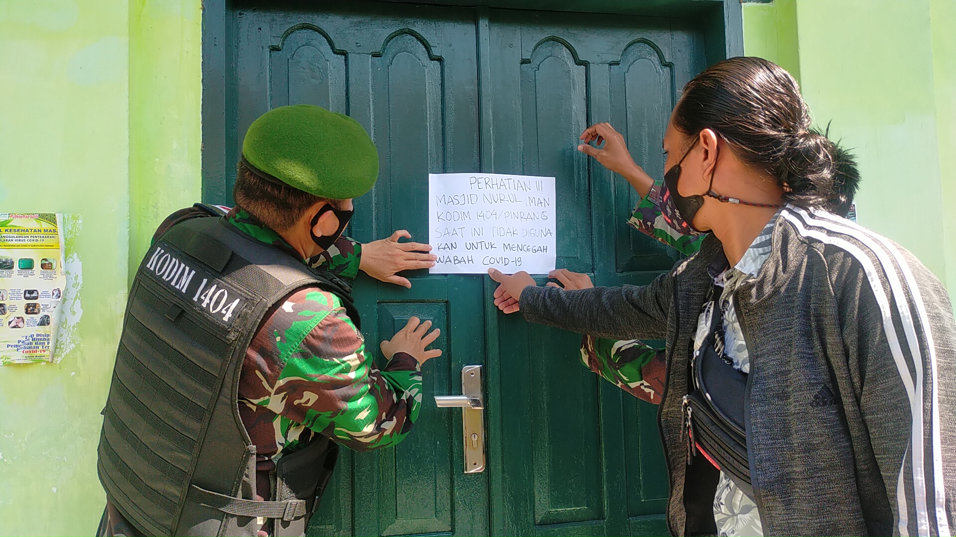 Dandim 1404 Pinrang Letkol Inf M Wahyudi Amri setelah melaksanakan pertemuan dengan personil jajaran Makodim 1404 Pinrang bersama pengurus masjid Nurul Iman Makodim 1404 Pinrang langsung menuju ke Masjid Nurul Iman untuk memberikan himbauan melalui pengeras suara masjid dan melakukan pemasangan tulisan untuk larangan melaksanakan sholat Id secara berjamaah di masjid Nurul Iman Kodim 1404 Pinrang pada masa pandemi covid -19 yang saat ini mewabah di wilayah hukum Makodim 1404 Pinrang.”