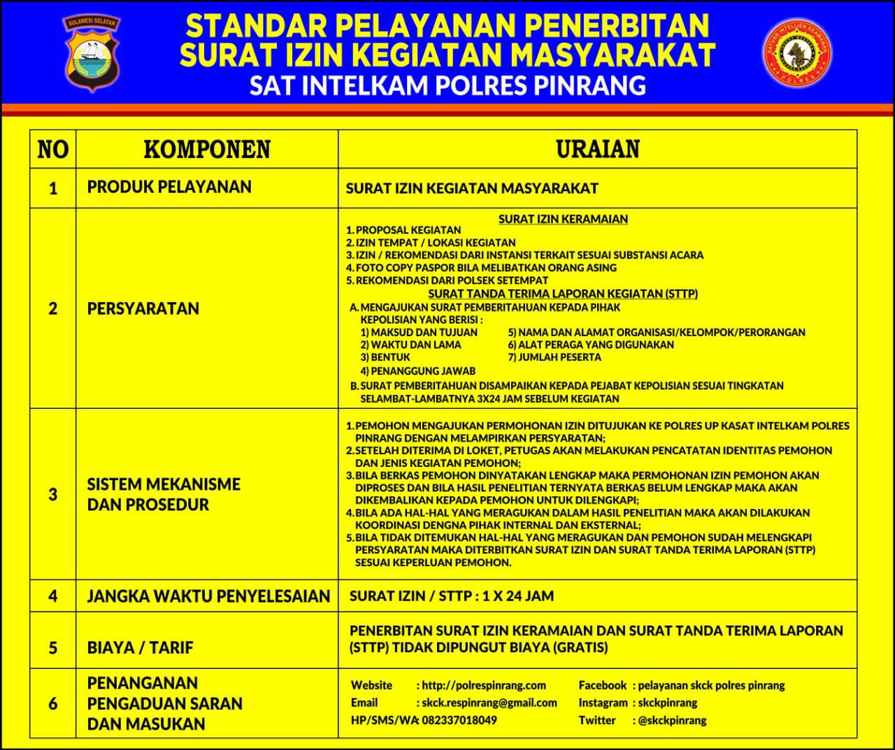 Kasat Intelkam Polres Pinrang AKP I.G.N. Adi Suarmita yang di konfirmasi awak media terkait syarat penerbitan surat izin kegiatan masyarakat mengatakan, “surat izin kegiatan masyarakat secara resmi yang akan diterbitkan oleh Instansi Kepolisian melalui fungsi Intelkam kepada seorang pemohon atau warga masyarakat, sebagai kelengkapan administrasi dalam melaksanakan kegiatan keramaian itu, penerbitannya akan dilakukan setelah pemohon atau warga masyarakat melengkapi beberapa persyaratan sebagai berikut.: