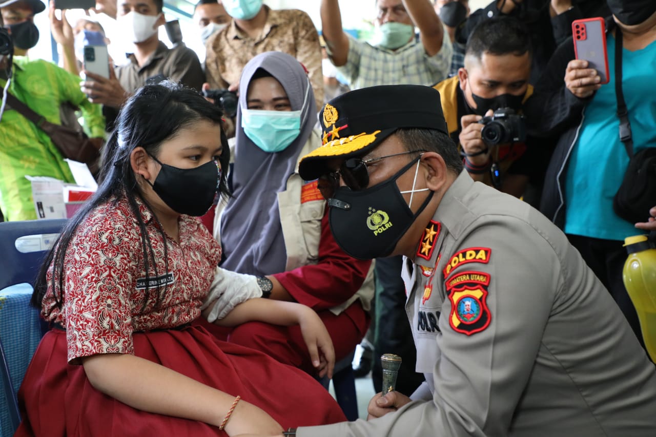 Disana, Kapolda Sumut juga melakukan dialog interaktif via zoom meeting dengan seluruh sekolah yang melaksanakan vaksinasi terhadap anak usia 6-11 tahun di Kab. Serdang Bedagai