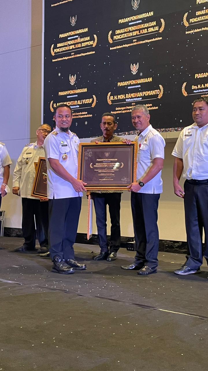 Gubernur Sulsel Serahkan Dua Penghargaan Kepada Dinas Dukcapil Kabupaten Pinrang