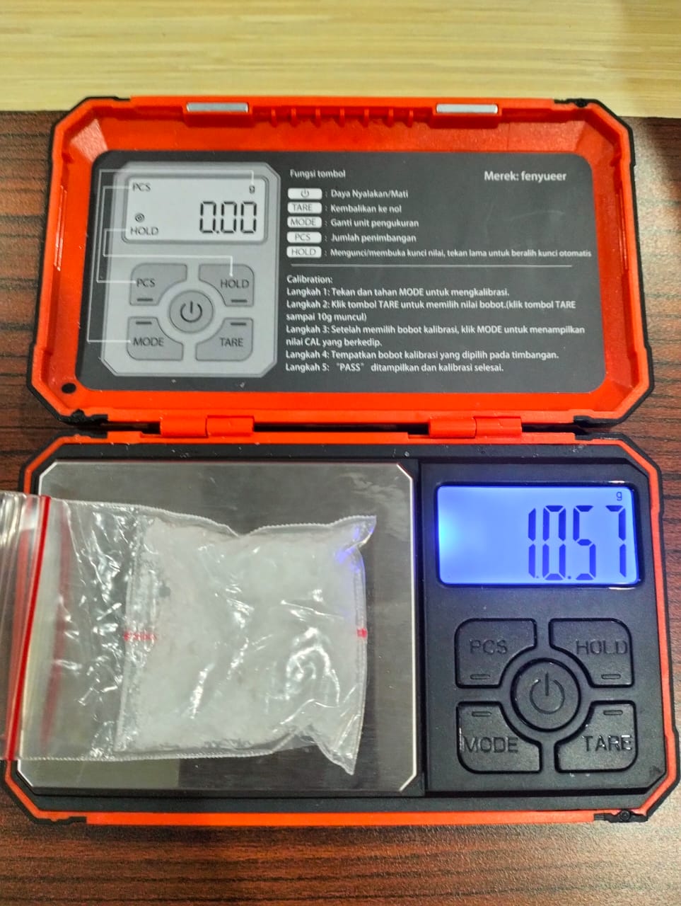 Dari hasil penggeledahan, petugas menemukan barang bukti berupa satu sachet plastik bening berisi kristal diduga sabu dengan berat bruto 10,57 gram, yang sempat dilempar oleh tersangka ke jalan saat mencoba melarikan diri. Selain itu, diamankan pula sebuah bungkus rokok, satu lembar tisu, dan satu unit Handphone berwarna hitam yang digunakan tersangka dalam menjalankan aksinya.