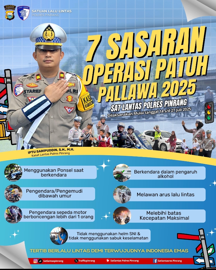 Iptu Saripuddin membeberkan bahwa ada tujuh sasaran utama dalam operasi patuh Pallawa 2025 dan apabila dalam operasi patuh tersebut di dapati masyarakat yang melanggar salah satu dari tujuh sasaran itu akan dikenakan undang – undang 22 tahun 2009 tentang lalu lintas dan angkutan jalan dimana pasal – pasla dalam operasi patuh tetap disesuaikan dengan pelanggarannya.”