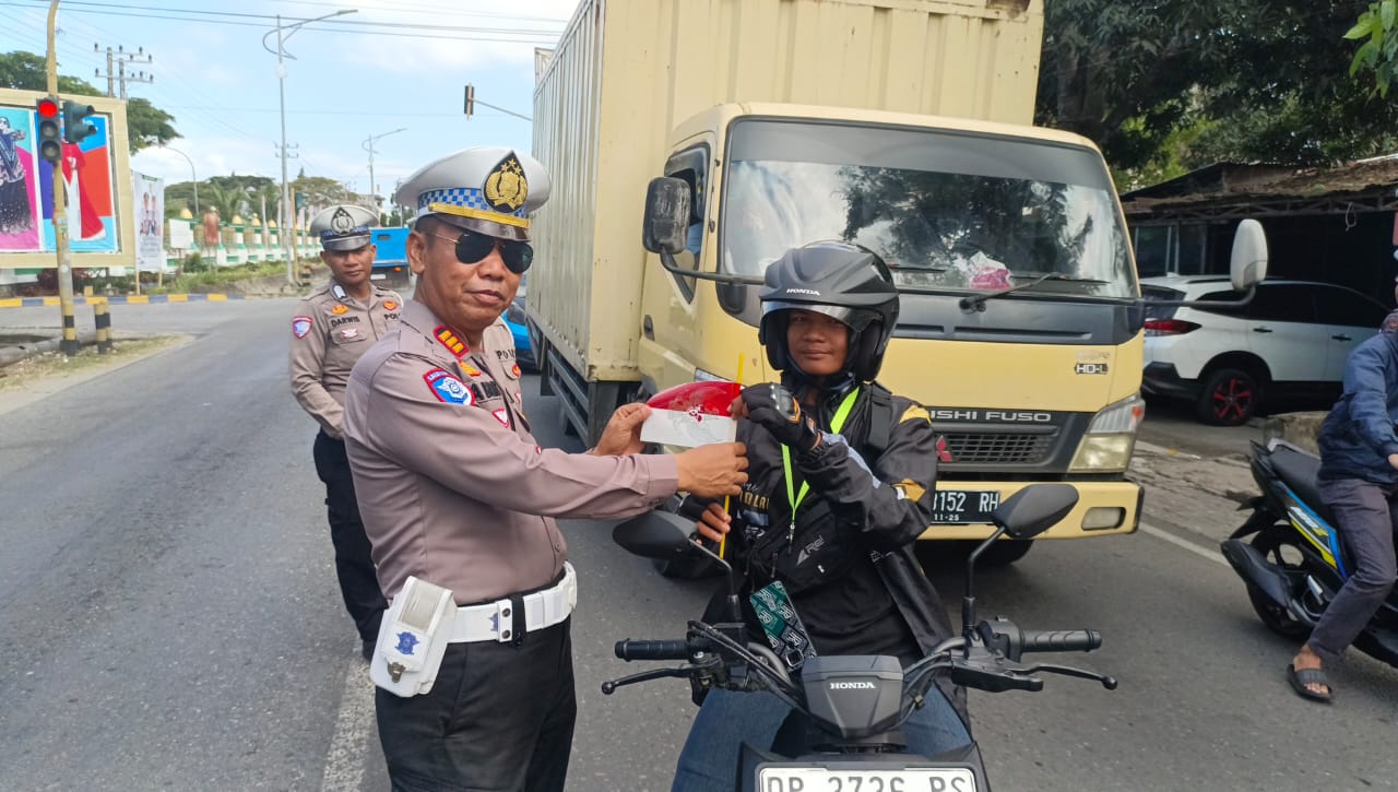 AKP Abang Lamudding kepada awak media menuturkan, giat Polantas menyapa ini bertujuan untuk meningkatkan rasa kebangsaan serta memeriahkan rangkaian peringatan hari kemerdekaan Republik Indonesia Ke-80.