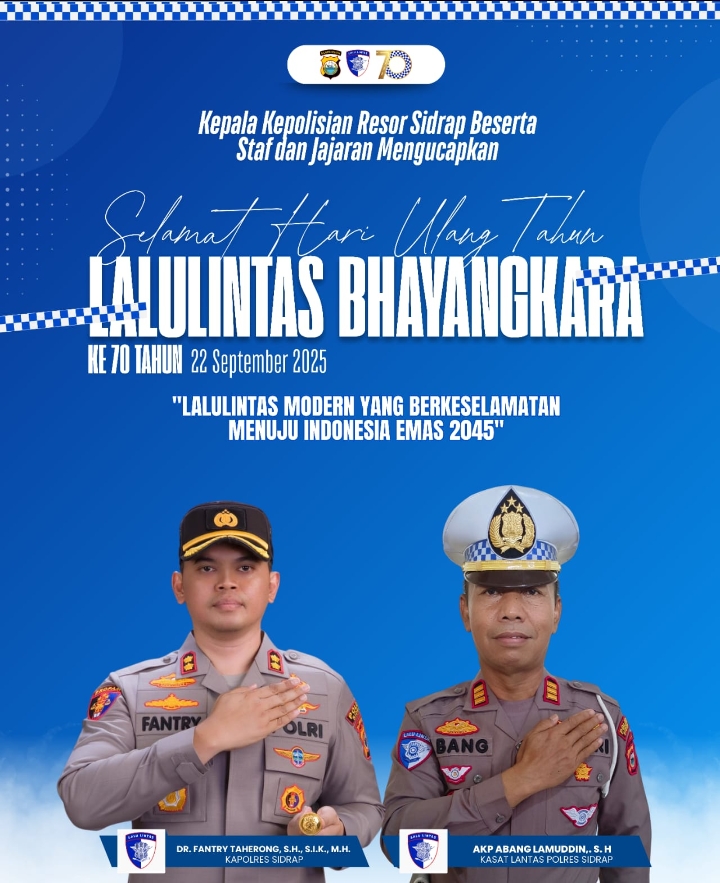 SIDRAP, BESTNEWS – Kasat Lantas Polres Sidrap, AKP Abang Lamudding, menyampaikan ucapan selamat Hari Ulang Tahun Lalu Lintas Bhayangkara ke-70 yang jatuh pada September 2025.