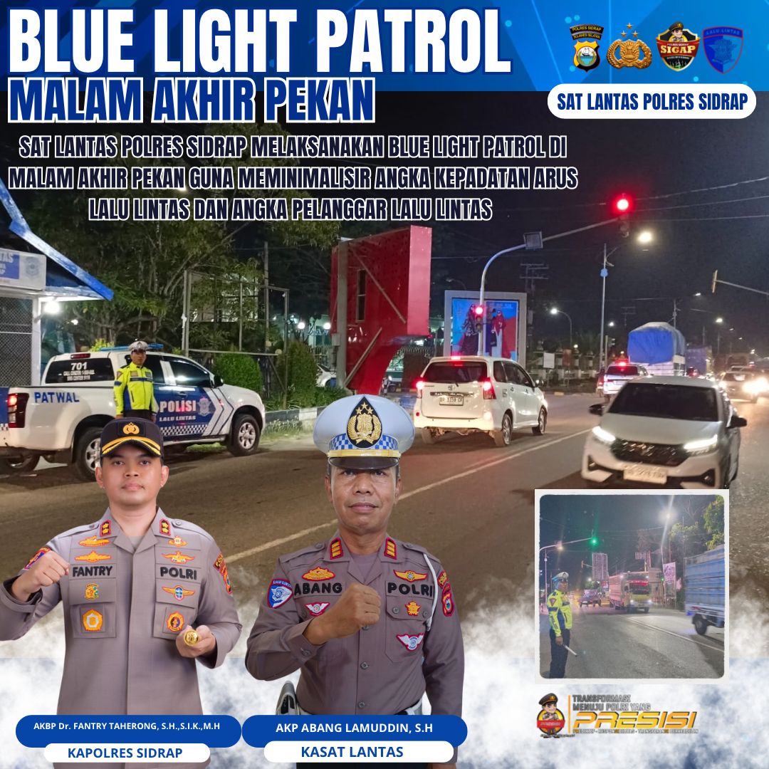 SIDRAP, BESTNEWS — Di tengah hiruk-pikuk malam akhir pekan, cahaya biru lampu rotator milik Satuan Lalu Lintas Polres Sidrap menembus gelapnya jalanan utama. Dipimpin langsung oleh Kasat Lantas Polres Sidrap, AKP Abang Lamudding, operasi Blue Light Patrol kembali digelar dengan tujuan utama: menekan angka kecelakaan dan pelanggaran lalu lintas yang kerap meningkat di penghujung pekan.