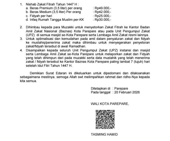 Penetapan tersebut diumumkan melalui Badan Amil Zakat Nasional (BAZNAS) Kota Parepare. Kepala BAZNAS Parepare, Irwan Yusuf Caco, saat dikonfirmasi via pesan singkat, Selasa (24/2/2026), menjelaskan bahwa zakat fitrah ditetapkan dalam beberapa kategori.